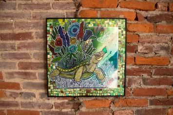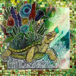 ADDITIONAL DETAILS: Akupara is the name of the Hindu world turtle. A world turtle, also known as the cosmic turtle or tortoise, is a myth featuring the animal bearing the universe on its back. This archetypal image is also used in some Native American and East Asian myths. And in nature, turtles or tortoises coming out of hibernation underground can be covered in layers of earth, which makes it easy to see how such a myth could evolve. This artwork is a more whimsical depiction, with a young Akupara covered in flowers.