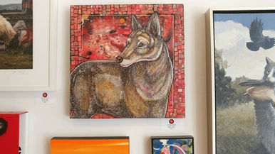 Medium: ink, acrylic, hand-cut-and-colored paper collage on wood panel.