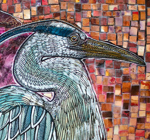 Medium: ink, acrylic, hand-cut-and-colored paper collage on wood panel.