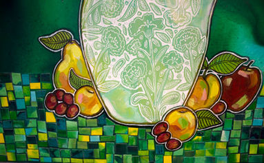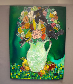 Medium: ink, acrylic, and "Fauxsaic" (hand-cut and colored paper collage) on wood panel.