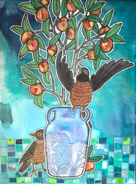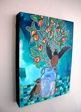 Medium: ink, acrylic, and "Fauxsaic" (hand-cut and colored paper collage) on wood panel.